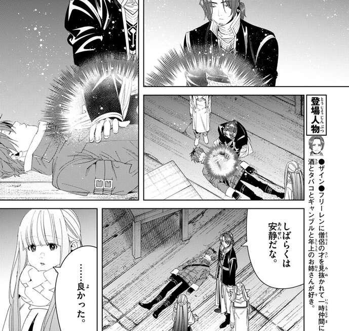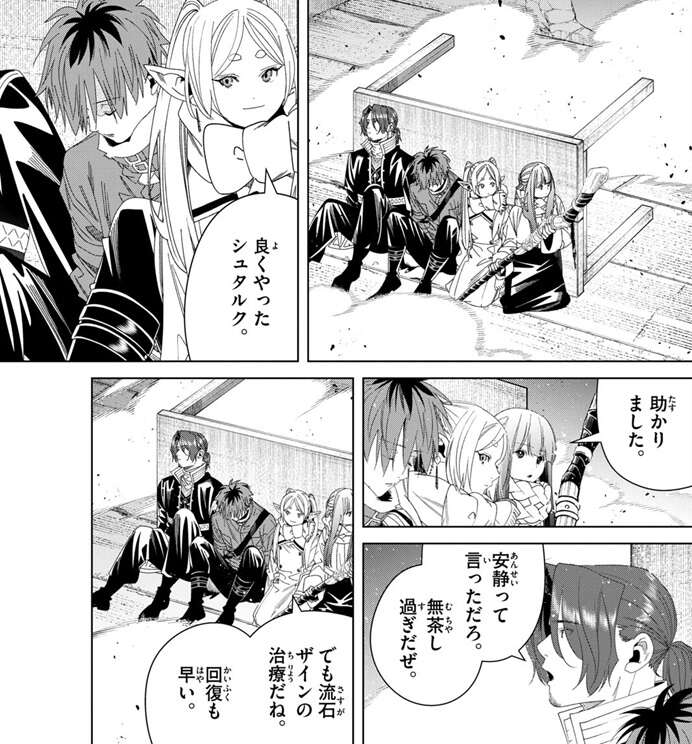 ザインは事情を聴きたいところだと言いますが、シュタルクの様子を見てまずはシュタルクの状態を見ます。ザインはシュタルクの状態を見ると、シュタルクの毒を治療します。フリーレンは、街中でザインの魔力を感じたことをフェルンに説明し、魔力を出してザインに存在を知らせていた事を説明します。