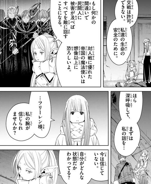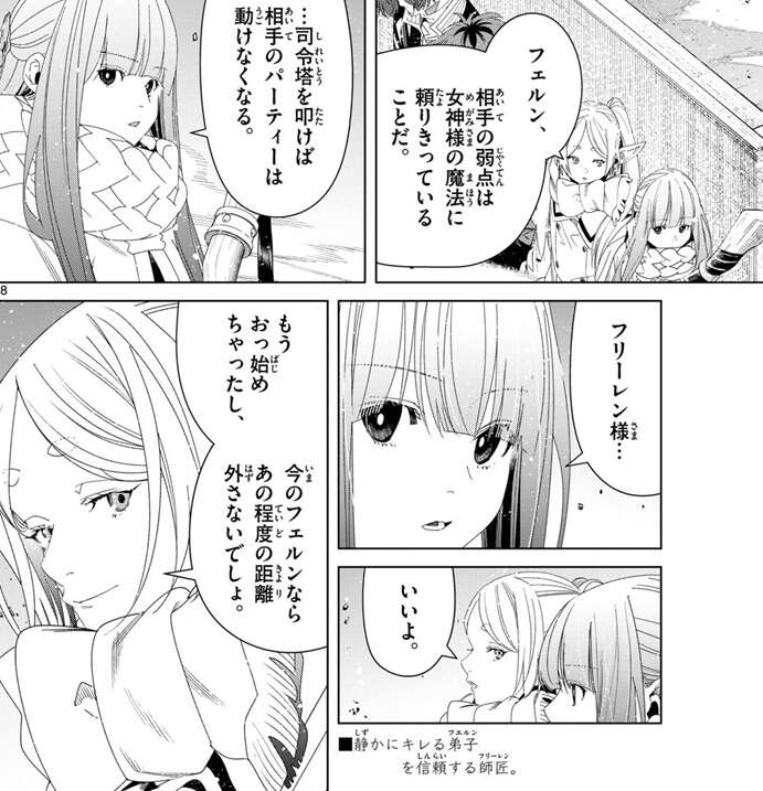 ザインが先ほど指さした僧侶の位置は適当でないとフリーレンはザインに確認すると、フェルンに相手の弱点は女神様の魔法に頼り切っている事だと言います。司令塔を叩けば相手のパーティは動けなくなる、とフェルンが言うと、フリーレンは街中での攻撃の許可をフェルンに出します。