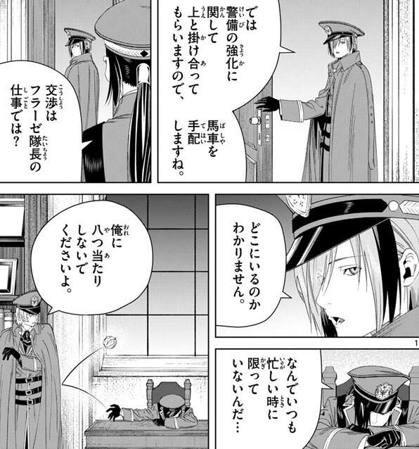 魔導特務隊の任務は建国祭期間中の帝都の治安維持で、大陸魔法協会だろうが、影なる戦士だろうが、治安を乱すようであれば対処せねばならない、とカノーネが言うと、隊員は警備の強化に関して上と掛け合ってもらうので、馬車を手配しますとカノーネに言います。しかし、交渉は副隊長のカノーネではなく隊長のフラーゼの仕事では?とカノーネは言いますが、フラーゼはどこにいるか分からないようで、結局カノーネが交渉することになり、不機嫌になったカノーネはノイに八つ当たりをします。