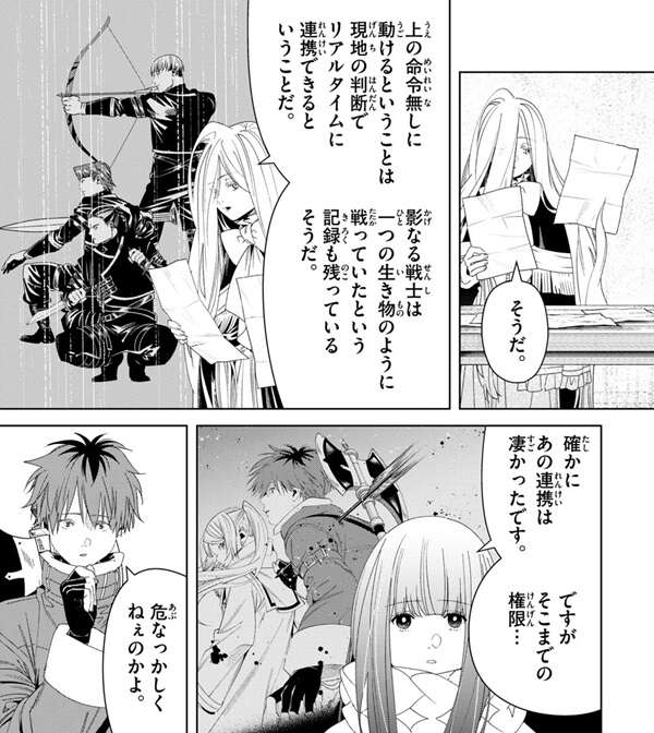 ゼンゼもフリーレンの推測に同意し、上の命令無しに動けるということは現地の判断でリアルタイムに連携できるということだ、影なる戦士は一つの生き物のように戦っていたという記録も残っているそうだ、とゼンゼは言います。フェルンも市街地での戦闘を思い出し、あの連携はすごかったと言います。しかし、フェルンとシュタルクはそこまでの権限を影なる戦士に与えるのは危なかっしくねぇのかよと言いますが、フリーレンはパーティー戦闘を例に出し、フリーレン一行ではパーティーで戦う時はフリーレンが指揮を執りますが、私は危ない?とシュタルクに聞きます。シュタルクは、フリーレンは悪い奴じゃねぇだろ、と答えますが、つまり指揮官次第ってこと、とフリーレンは言います。