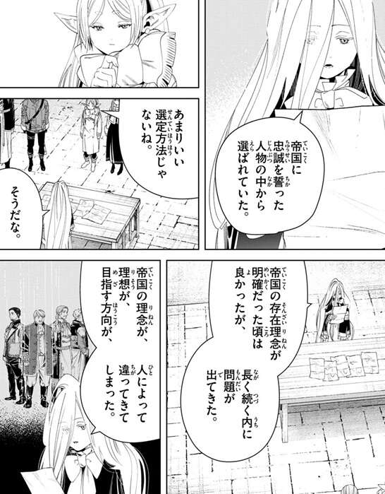 権限を与える指揮官は慎重に選んでいたようですが、ゼンゼはその選定方法を帝国に忠誠を誓った人物の中から選んでいた、と言いますが、それを聞いたフリーレンはあまりいい選定方法じゃないねと言います。帝国の存在理念が明確だった頃は良かったようですが、帝国の理念が、理想が、目指す方向が、人によって違ってくるようになると、影なる戦士は次第に帝国の意志通りに動かなくなっていたようです。