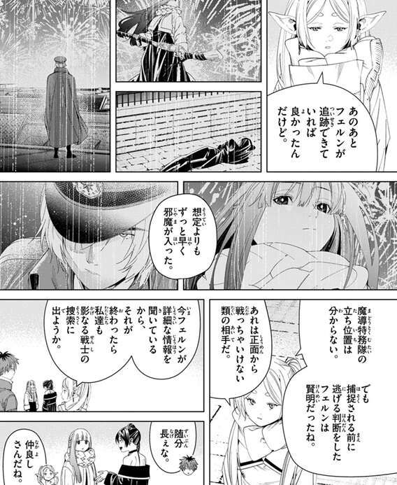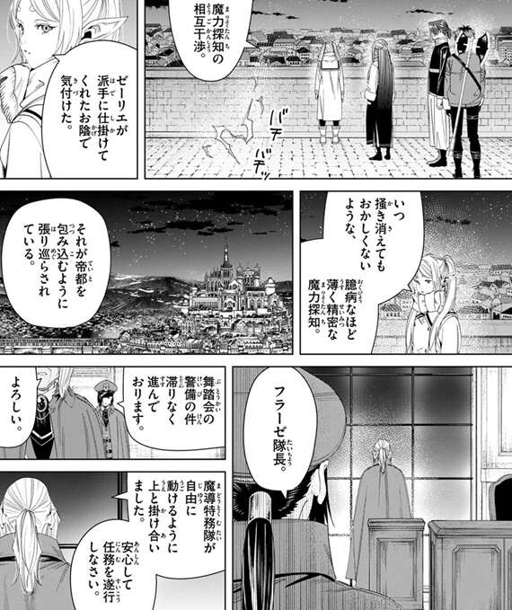 もう一人は帝都のすべての事象を監視している何者かのようで、ついさっきゼーリエの魔力探知が帝都の全域を覆った事をフェルンに教えます。ゼーリエはフリーレン達には認識できない何者かに喧嘩を売っているようです。フリーレンにとっても魔力探知するにはかなり相手の魔力は“薄い”ようです。