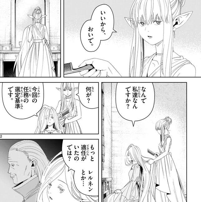 今度はゼンゼに座るように言い、ゼンゼの髪を結んでやろうとします。ゼンゼは髪くらい自分の魔法で出来ますと言いますが、いいから、おいで、とゼーリエは言いゼンゼを椅子に座らせます。ゼーリエが髪を結んでいる間、ゼンゼは今回の任務の選定基準を質問します。レルネンとか他にもっと適任がいたのではとゼンゼは言いますが、ゼーリエはあいつが舞踏会に来れる訳がないと言います。レルネンは50年以上前に宮殿から出禁を食らっていて、ゼンゼは、何やったんだあの人…、とつぶやきます。ただ、レルネンも動いていない訳ではないようで、ヴァイゼに移送されたグリュックやデンケンをレルネンが出迎えています。デンケンやレルネンも、今後何か動きがあるかもしれません。