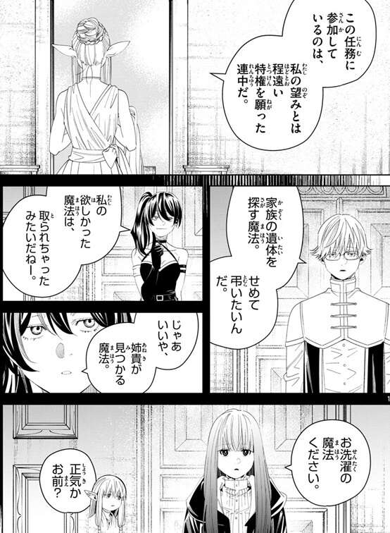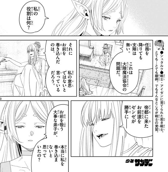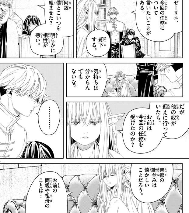 ゼーリエは選定基準に話を戻し、ゼンゼに特権に何を願ったか覚えているかと聞きます。ゼンゼは片時も忘れたことはないと答えますが、ゼーリエは、私はあのとき失望した、この子には類い稀なる才はあれど、決して強い魔法使いにはなれないと、と言います。そして、この任務に参加しているのは、私の望みとは程遠い特権を願った連中だ、とゼーリエは選定基準を明かします。ラントは家族の遺体を探す魔法を家族を弔う為に、ユーベルは姉貴が見つかる魔法を、フェルンはお洗濯の魔法を、それぞれ特権に願っています。