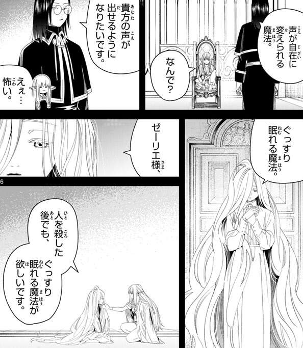 ゼーリエは、不思議なものだな、才ある者は両極端なんだ、力を願った者と願わなかった者、前者は私の望み通りの理想の魔法使いになり、後者は私の想像を超える魔法使いになる、と言い、今回の任務では後者の者をゼーリエは選んだことが判明します。そしてファルシュは声が自在に変えられる魔法を選び、理由はゼーリエの声が出せるようになりたいと言い、ゼーリエに、えぇ…怖い、と引かれます。さらにゼンゼはぐっすり眠れる魔法を選び、その理由に人を殺した後でも、ぐっすり眠れる魔法が欲しいです、とゼーリエに明かします。