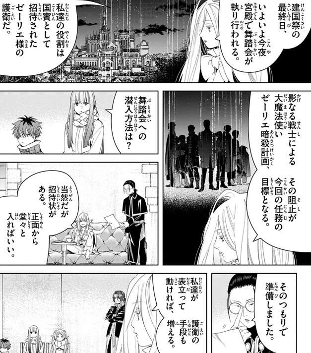 今夜、いよいよ宮殿で舞踏会が執り行われます。ゼンゼやフリーレン達の役割は、国賓として招待されたゼーリエの護衛です。影なる戦士によるゼーリエ暗殺計画の阻止が今回の任務の目標で、ゼーリエには招待状があるので正面から堂々と入っていけます。従者の数に制限はないようなので全員で向かえますが、ラントとユーベルは魔導特務隊から脱走している身なので、自分達は別ルートから入るとラントは言います。