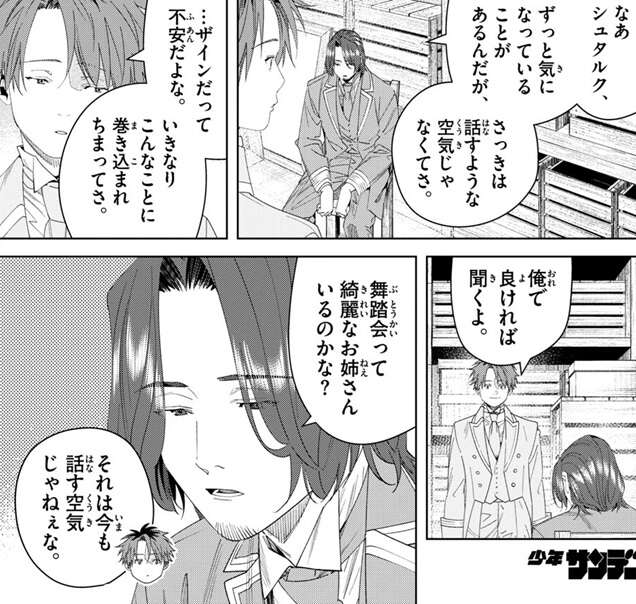 そして、全員が舞踏会に行くために正装に着替えます。シュタルクとザインが正装に着替えていて、ザインは正装に着慣れていないようで不満そうですが、シュタルクは動きやすいと満更でもないようです。ザインは深刻そうな雰囲気で、さっきは話すような空気じゃなかったが気になっている事があると言い、シュタルクは俺で良ければ聞くよと言います。しかし、ザインが気になっていたのは舞踏会って綺麗なお姉さんがいるか?で、ザインの相変わらずの性格にシュタルクもあきれます。