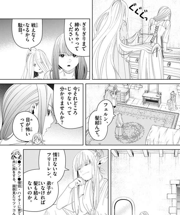 フェルンはコルセットをぎりぎりまで締めるようにゼンゼに要求しますが、ゼンゼは戦えなくなるから駄目と言います。かなり気にしているようですが、もしかしてフェルンは体形を気にしている……、いや、そんな事はないでしょう…、多分。結局、ゼンゼが時間を掛けてフェルンを説得し、十全に戦えるように調整できたようです。