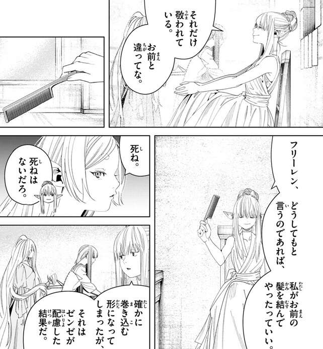 フリーレンは、ゼーリエだって似たようなものでしょ、と言い返しますが、ゼーリエは、それだけ慕われている、お前と違ってな、とさらに言い返します。そして、ゼーリエはフリーレンの髪を私が結んでやってもいいと言いますが、死ね、とフリーレンからきつい言葉が返ってきます。ゼーリエは今回の任務に巻き込む形になったが、それはゼンゼが配慮した結果でゼーリエの意志ではないと言い、不満があるのなら任務を降りて構わないし、フェルンにも無理強いはしないと、ゼーリエはフリーレンに言います。