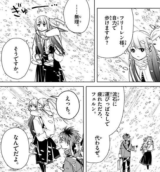 場面は現代に戻り、フリーレン達は北側諸国、シュヴェア山脈を進んでいますが、雪山を吹雪の中、進んでいます。フリーレンはこのまま北に進めば目的地の集落があると言い、その集落を目指します。フェルンはフリーレンに自力で歩けるか聞きますが、まだ無理のようです。シュタルクが変わろうとしますが、えっち、とフリーレンは言い拒否します。