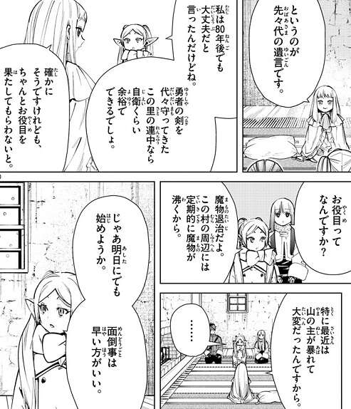 里長が、半世紀後にまた来てもらう約束だったのに、温厚な私でも流石にブチギレですよ、というのがおばあさまの遺言です、と里長はフリーレンに伝えます。先々代とフリーレンはそんな約束をしていたようですが、フリーレンはこの里の連中なら自衛くらい余裕だと考えたようで、80年後でも大丈夫だと先々代の里親にも伝えていたそうです。遺言ではフリーレンにお役目を果たしてもらいたかったようで、お役目とはこの村の周辺に定期的に沸く魔物退治の事です。最近は山の主が暴れて大変だったと里長が言うと、面倒毎は早い方がいいと、フリーレンは明日から始めようか、と言います。