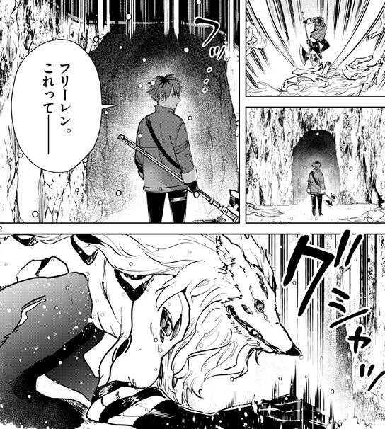フリーレンがシュタルクに、まだ動けるでしょ、と声をかけると山の主の片方の前脚が吹き飛びます。人使い荒すぎるだろ、とシュタルクがボヤいている隙に、山の主はフリーレンに襲い掛かりますが、フェルンが簡単に魔法で攻撃を防ぎます。