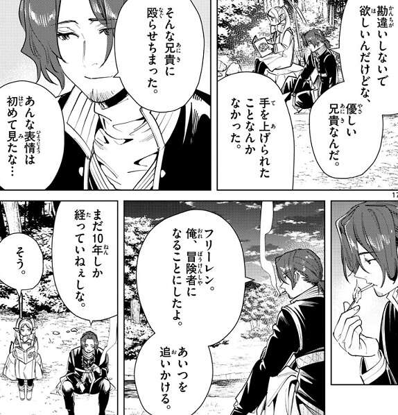 ザインは兄に謝ってきたと言い、勘違いしないで欲しいんだけどな、優しい兄貴なんだ、手を上げられたことなんかなかった、とザインはフリーレンに話します。そしてザインは冒険者になることを決意し、親友を追いかけると言います。しかし、旅の目的は親友を探すことで、フリーレン達と一緒に行くのは途中までだ、と釘をさします。
