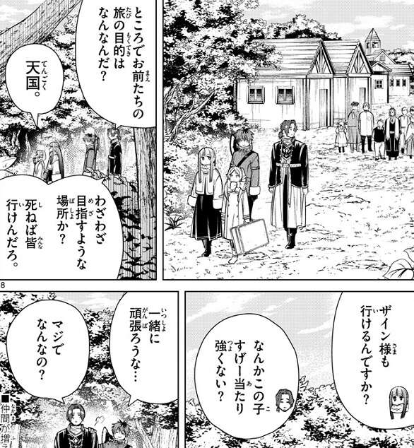村を出たフリーレン達ですが、ところでお前たちの旅の目的はなんだ?と、ザインがフリーレン達に質問します。フリーレンは天国と答えますが、わざわざ目指すような場所か?死ねば皆行けんだろ、とザインは言います。フェルンは、ザイン様も行けるんですか?と、ツッコみ、なんかこの子すげー当たり強くない?と、ザインはフェルンの自分に対する扱いに釈然としないものを感じます。
