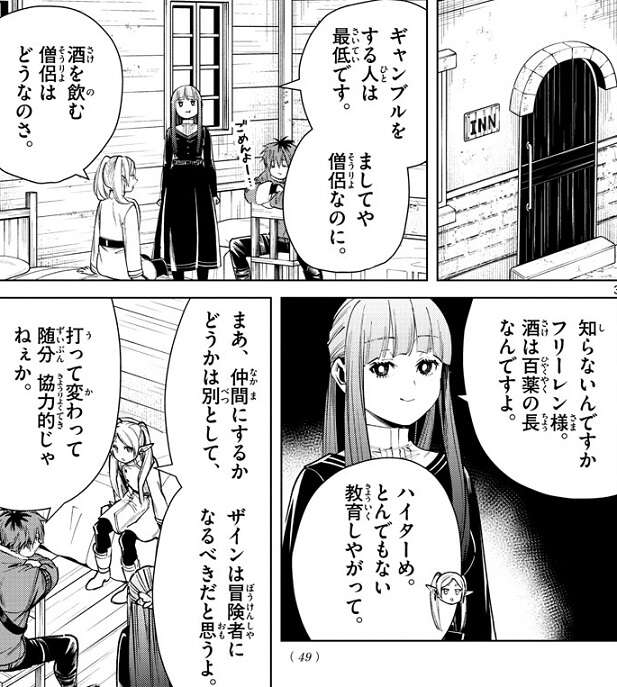 ザインが、一体何をしたっていうんだ…、と抗議しますが、フェルンはシュタルクの身包みを剥がしたことに怒っています。フリーレンが、酒を飲む僧侶はどうなのさ、と意見しますが、酒は百薬の長でいいそうです。フリーレンは、フェルンが酒には寛容になるように教育したハイターに呆れます。