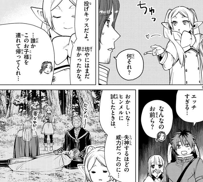 シュタルクがザインに、年上のお姉さんと旅がしたくないか?と聞くと、ザインは思いっきり食いついてきます。しかし、年上のお姉さんがフリーレンと聞きすごく辛そうにします。フリーレンはエルフなので人間のザインからしたら、かなりの年上ですがザインの理想のお姉さんとは違いすぎています。しかたなく、フリーレンは色仕掛けの投げキッスをします。ザインには全然、通用しませんが、フェルンやシュタルクからすると、エッチすぎるようです。ちなみに、昔ヒンメルに試したら失神するほどの威力だったそうです。