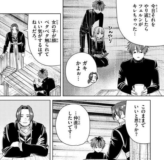 それから一月、フリーレン達が村で思い思いに過ごし、そろそろ寒波の時期が終わろうとするとき、フリーレンがザインのいる酒場を訪れます。なんだかシュタルクとフェルンの様子がおかしい、とフリーレンは言い、たぶん喧嘩しているので仲裁してよ、ザインに頼みます。小屋に戻ると、フェルンがつーんと怒っており、シュタルクがめそめそと泣いています。フェルンはシュタルクが悪いと言い、シュタルクは俺が悪いです…、と言いますが、話にならないとザインは一人ずつ隣の部屋で話を聞きます。