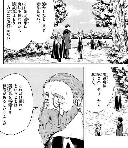 しかしデンケンは、これほど派手に魔法を使われたら、隕鉄鳥はもうこの湖に近づかない、と言い隕鉄鳥は第2パーティーから奪うことにします。これだけ暴れたということは隕鉄鳥を捕獲する算段がある、とデンケンは予想します。