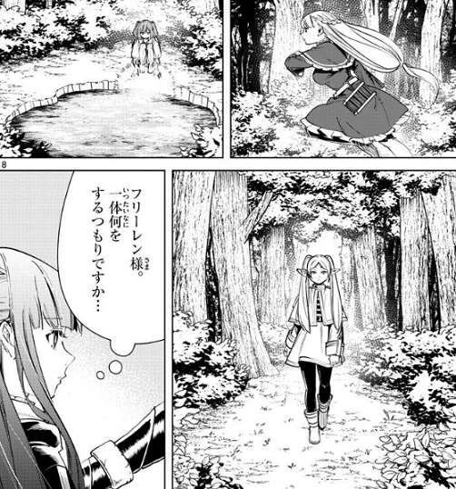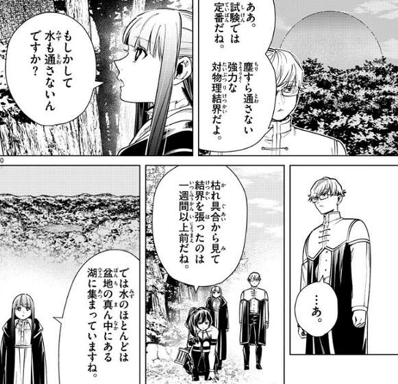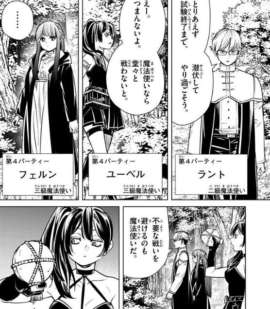 場面変わって、第4パーティーのフェルンのパーティーは、既に隕鉄鳥を捕らえていて、試験終了まで潜伏して他のパーティーをやり過ごそうと話しています。その前に水の補充をしようと中央の湖に向かいますが、途中にある川は枯れています。