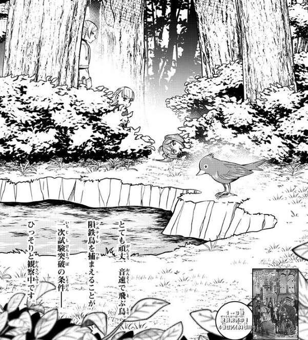 試験区域を囲むように張られている結界が水を通さないせいで、ほとんどの川が枯れているようです。水のほとんどは湖に集まっているようで、水場に集まる隕鉄鳥を狙って最大の水場である湖の周りに受験者が集まっていると、ラントは予想します。ラントは不要な戦いを避けるため、水を諦めようとしますが、他の受験者に見つかってしまいます。