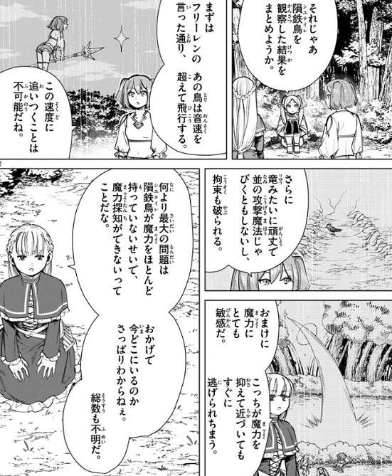 フリーレン達は、今まで隕鉄鳥を観察した結果を話し合っています。カンネは、隕鉄鳥は音速を超えて飛行するので追いつくのは不可能、さらに竜みたいに頑丈なので拘束も破られる、と観察した結果を話します。ラヴィーネは、隕鉄鳥は魔力にとても敏感で魔力を抑えていても、近づくとすぐに逃げられると話します。さらに隕鉄鳥が魔力をほとんど持っていないので、隕鉄鳥に対して魔力探知が出来ない、と話します。