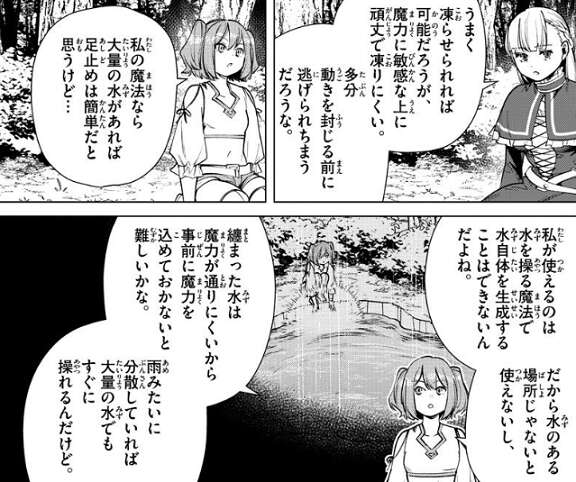 38話では魔物に対して使っていましたが、鳥みたいなやつは全部捕らえられるみたい、とフリーレンは話します。それを聞いてラヴィーネが、なんでそれを黙っていたんだよ、と言いますが、この魔法の射程は50cmで、そこまで近付かないと駄目なんだ、とフリーレンは言います。今までは最大で3mまでしか近付けておらず、しかも20mくらい近付いた時点で隕鉄鳥に気付かれています。フリーレンが二人の魔法では隕鉄鳥の足止めは難しいか確認すると、ラヴィーネは、上手く凍らせれれば可能だろうが、魔力に敏感な上に頑丈で凍りにくい、と多分逃げられるだろうと言います。カンネは、自分が使えるのは水を操る魔法で水自体を生成することはできないんだよね、水のある場所じゃないと使えないし、まとまった水は魔力が通りにくいから事前に魔力を込めておかないと難しいかな、と言います。