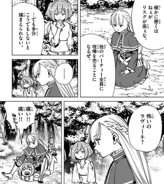 でも水に魔力を込めたら魔力に敏感な隕鉄鳥は、絶対寄ってこないだろうね、ともカンネは言いますが、それを聞いてフリーレンは、この作戦ならいけるかも、と作戦をカンネとラヴィーネに説明します。作戦をフリーレンから聞いてラヴィーネは、他のパーティー全員に喧嘩を売ることになるぜ、とリスクが高いと言います。迷っているラヴィーネに、怖いのラヴィーネ?と、カンネが聞くと、ラヴィーネは馬乗りになってカンネの髪を引っ張ります。そして、わかったよ、やってやろうじゃねぇか、とラヴィーネも作戦をやると決意します。