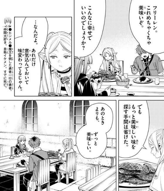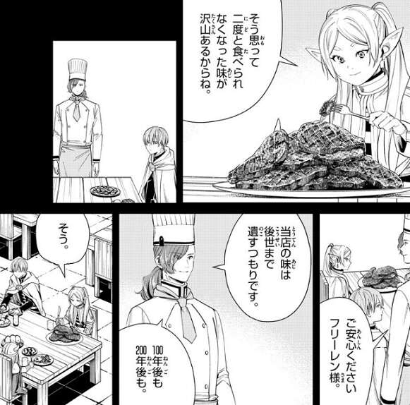 この時もフリーレンはすごい量の肉を頼み、一度にそんなに食べなくてもまた来ればいい、とヒンメルから言われます。そう思って二度と食べられなくなった味が沢山あるからね、とフリーレンが言うと、レッカーは、当店の味は後世まで残すつもりです、100年後も200年後も、と言いフリーレンに安心するように言います。しかし、フリーレンは料理人は皆そう言う、そう言って過去の料理の味を変えて爪痕を残そうとする、とつぶやきます。