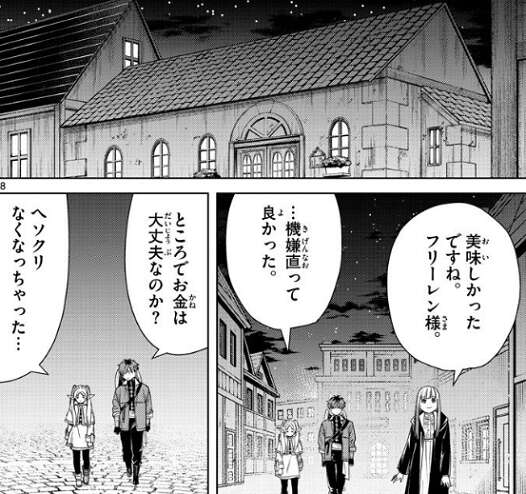 飯屋の中では、デンケン達や、ユーベルとラントも、食事を楽しんでいます。飯屋で食事を楽しみフェルンは機嫌を直しましたが、お金は大丈夫なのか、シュタルクはフリーレンに聞いています。あまり大丈夫ではないようでフリーレンは、ヘソクリがなくなっちゃった…、と少しへこんでいます。