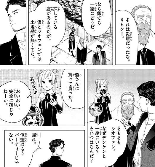 デンケンと一緒のパーティーだったリヒターは、町でお婆さんの灯りを直しています。灯りを直したお礼にとあめを渡されていて、町ではリヒターは結構、慕われているようです。そこにデンケンとラオフェンが来てリヒターを飯に誘います。しかしリヒターは、第一次試験の最後に殴り合いの喧嘩をやらされたので、体を休めたいと断ります。