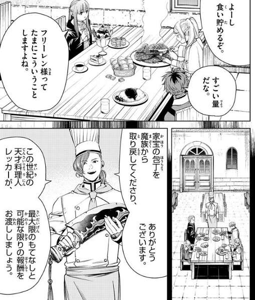 デンケンやリヒターが訪れた飯屋には、フリーレン達も来ていてフリーレン達は既に注文をしています。デンケンは放っておけと言い、自分達だけで食事を楽しみます。一方、フリーレンは喰い貯めるぞ、と言いすごい量の肉を頼みます。その料理を見て、ヒンメル達と一緒にこのお店の料理を食べた時の事を思い出します。ヒンメル達は、料理人レッカーの家宝の包丁を魔族から取り返し、レッカーに返したお礼に料理をごちそうしてもらいます。