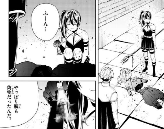 ユーベルは複製体が奪った脱出用のゴーレムの瓶を確認しますが、瓶は偽物でユーベルは重傷を負っていた瀕死のラントは魔法で作られた分身だと確信します。ラントは、瀕死のラントが魔法で作られた分身とわかっていたのなら、何故死に急ぐような真似をしたのかユーベルに質問します。