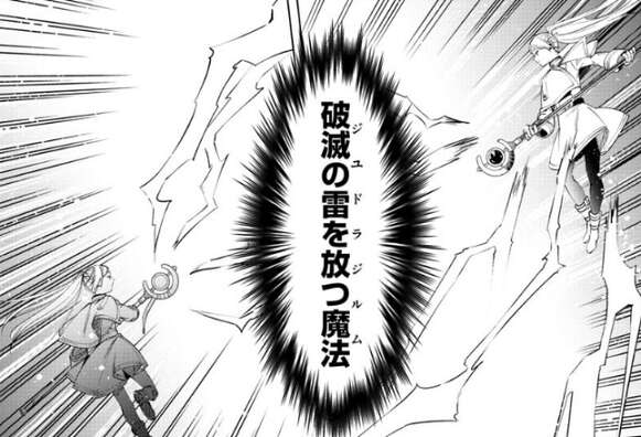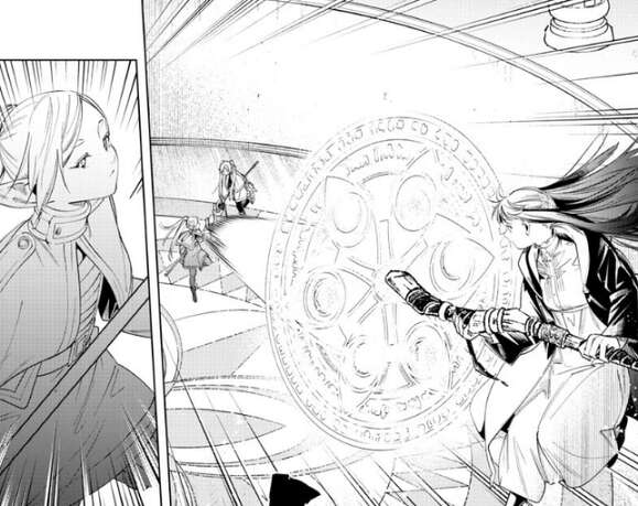 フリーレンとフェルンが扉の中に入り、フリーレンの複製体と対峙します。フリーレンとフリーレンの複製体がほぼ同時に、破滅の雷を放つ魔法(ジユドラジルム)を放ち、続いて二人は地獄の業火を出す魔法(ヴオルザンベル)を出します。