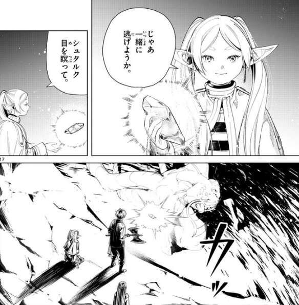 するとフリーレンは、じゃあ一緒に逃げようか、とシュタルクに目を瞑るように言うと、封魔鉱に魔力を込めて封魔鉱を光らせ、毒極竜を光で怯ませます。