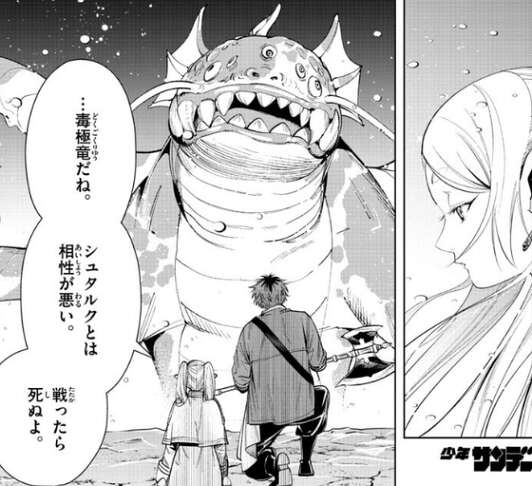 シュタルクがフリーレンを起こそうとすると、すぐ魔物が攻撃をしてきてシュタルクはフリーレンを掴んで何とか魔物の攻撃を避けます。魔物は毒極竜と言って、シュタルクとは相性が悪く、フリーレンは戦った死ぬよ、とシュタルクに言います。