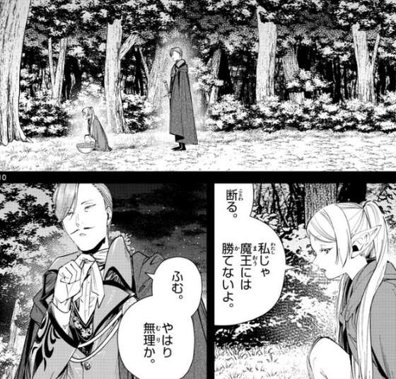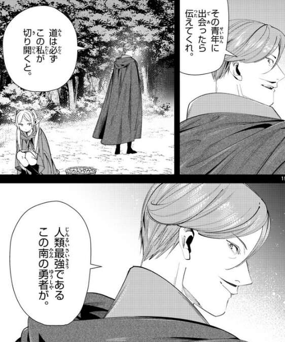 志半ばで私は死ぬが気に病む必要はない、仮にフリーレンが付いてきたとしても私の師という未来自体は変わらない、と南の勇者は言います。そして、近いうちに君の元に一人の若い勇者が訪れる、世界を救うのは彼だ、実に不本意ながら、と南の勇者はヒンメルが訪れる未来のこともフリーレンに教えます。そして、フリーレンがその青年達と共に旅に出て魔王を倒す、とも言いますが、フリーレンは信じようとしません。しかし南の勇者は、彼がフリーレンの人生を変えると断言します。