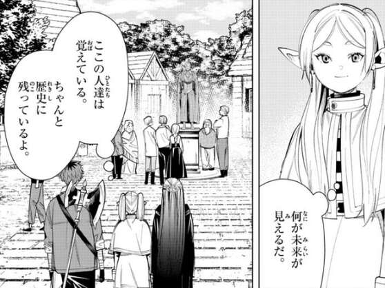フリーレンの回想は終わり、南の勇者の像は奇麗に磨き終わっています。フリーレンは報酬の“背中の痒い部分を掻く魔法”を貰い、大満足です。南の勇者の像の周りには大勢の村人が集まり、奇麗になった像を見上げています。それを見たフリーレンは、何が未来が見えるだ、ここの人達は覚えている、ちゃんと歴史に残っているよ、と心の中で南の勇者に語りかけます。