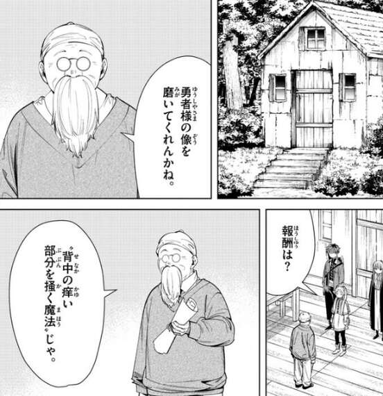 勇者ヒンメルの死から29年後、北側諸国、ファーベル村にて、勇者様の像を磨いてくれんかね、と村人から依頼があります。報酬は“背中の痒い部分を掻く魔法”と聞き、フリーレンはやる気を出します。