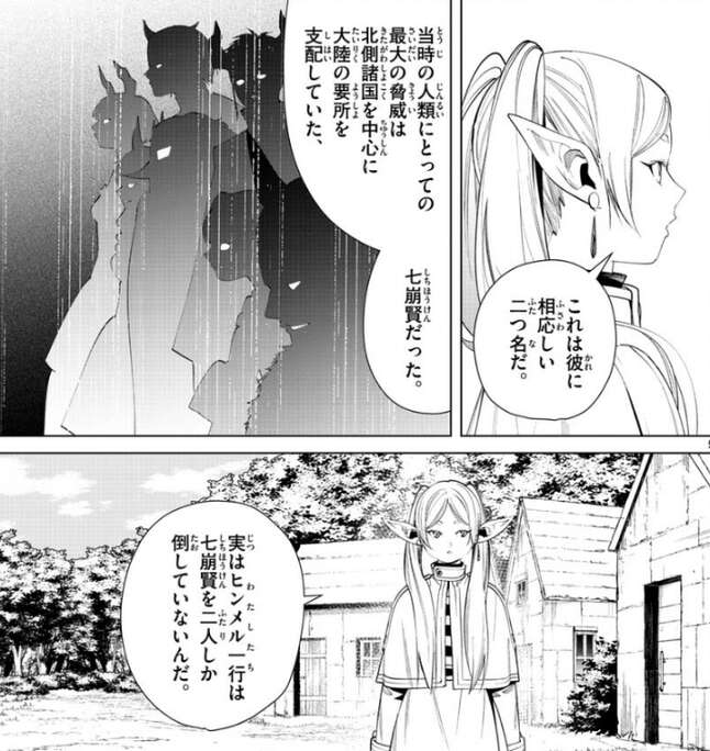 七崩賢には断頭台のアウラなどがいましたが、今回新たに七崩賢以外にも、魔王の腹心・全知のシュラハトという魔族がいた事が判明します。全知のシュラハトは千年後の未来を見通す魔法を操っていたそうですが、倒したのはヒンメルではなく、南の勇者ということがさらに分かります。今回の回想を見る限りだと、南の勇者はパーティーを組まず、一人で全知のシュラハトと七崩賢三人を倒しているように見えます。もしそうなら、確かに人類最強に相応しい勇者と言えそうです。