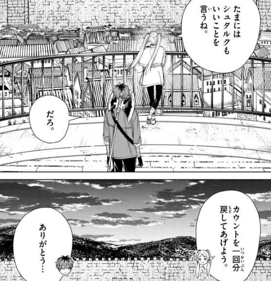 それを聞いたフリーレンは、たまにはシュタルクもいいことを言うね、とシュタルクを誉めて、カウントを一回分戻してあげよう、とさっきのお婆ちゃん発言を取り消してくれます。フリーレンがカウントを一回分戻してくれると聞き、ありがとう…、とシュタルクは答えます。