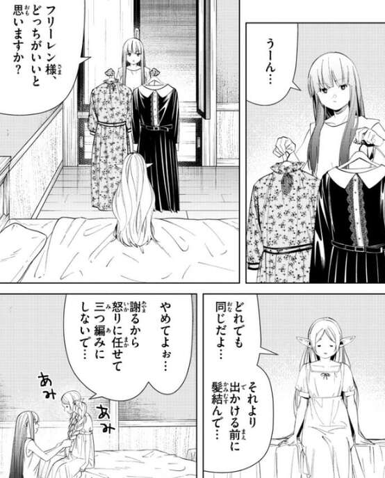 宿に戻ったフリーレンは、どっちの服がいいかと迷うフェルンから、どっちがいいと思いますか?と、質問されます。しかし、どれでも同じだよ…、とフリーレンは適当に答えてしまい、フェルンはフリーレンの髪を怒りに任せて三つ編みにし始めてしまいます。フリーレンは謝って止めてもらおうとしますが、フェルンは止めず結局フリーレンは三つ編みにされてしまいます。