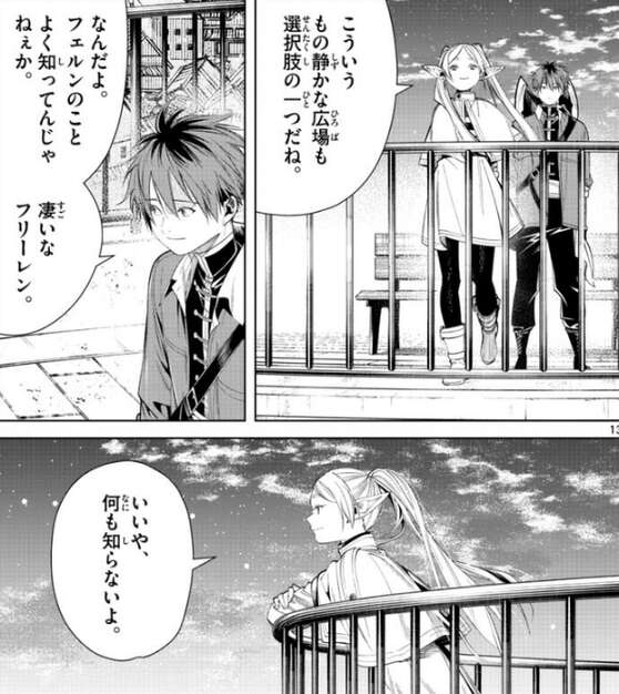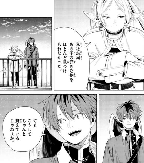ハイターはことあるごとにフェルンの好みをフリーレンに話していたようで、ハイターは私にフェルンの親代わりになる事を望んでいたようだ、とシュタルクに話します。しかし、私は結局あの子の好きな物をほとんど見つけられなかった、とフリーレンは少し寂しそうにシュタルクに話します。するとシュタルクは、でもこうしてちゃんと覚えているじゃねぇか、フリーレンはたぶんちゃんと親をやれてるよ、とフリーレンに答えます。