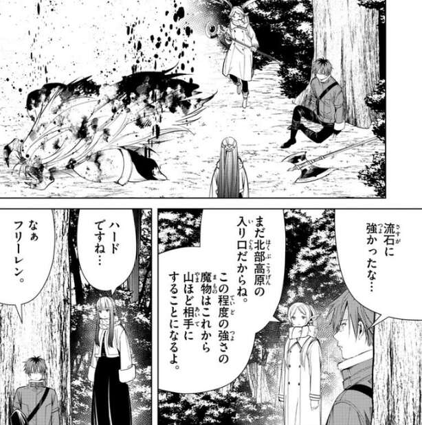 何とか魔物の群れを退けますが、三日三晩気が抜けず、フリーレン達は死ぬ思いをしてやっと集落にたどり着きます。集落では村人から、使っていない小屋を自由に使っていいと許可を貰えますが、その代わりとしてこの先の街道に出る強力な魔物を討伐して欲しいと頼まれます。その強力な魔物は自治を担っている騎士団などでは歯が立たず、行商人も来れぬようになってしまったようです。