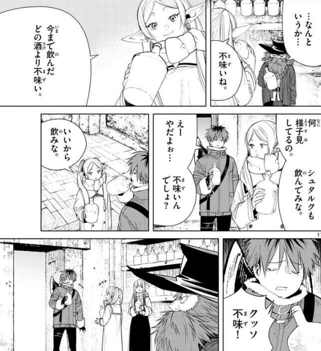 そして、不味い酒なんでしょ?なら皆で楽しまないと、とハイターはフリーレンに答えます。場面は現在に戻り、フリーレンも皇帝酒(ボーフハフト)を飲み、不味いね、今まで飲んだどの酒より不味い、とファスに言います。そして、何様子見してるの、シュタルクも飲んでみな、とシュタルクに皇帝酒(ボーフハフト)を飲むように言います。シュタルクは嫌がりますが、フリーレンが飲むように勧めると、シュタルクはいやいや皇帝酒(ボーフハフト)を飲んでみます。やはり不味かったようで、クッソ不味!と、シュタルクは叫びますが、皇帝酒(ボーフハフト)の不味い味を話題にしてフリーレン達は盛り上がります。