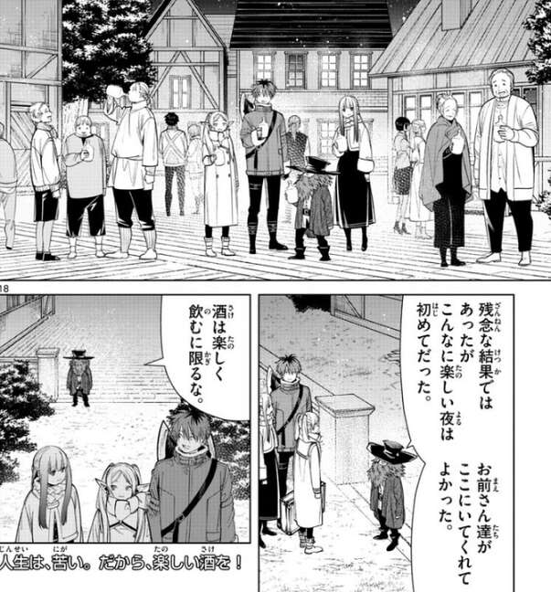 ファスはその光景を眺めた後、本当に不味いな、とつぶやいて、町の奴らも道連れだ!と、皇帝酒(ボーフハフト)を町の住民に配ります。町を出ようとするフリーレン達にファスは、残念な結果であったが、こんなに楽しい夜は初めてだった、お前さん達がここにいてくれてよかった、と話しかけます。そしてフリーレン達を見送りながら、酒は楽しく飲むに限るな、とつぶやきます。