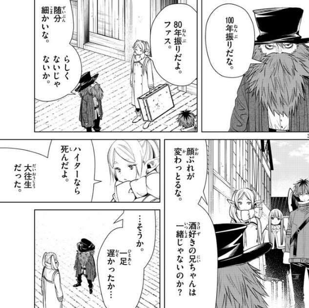 北部高原唯一の穀倉地帯の街に辿り着きますが、その街は醸造が盛んで、酒場も多い街でした。その街でファスというドワーフにフリーデンは再開します。ファスは皇帝酒(ボーフハフト)を探していて、遺跡でやっと皇帝酒(ボーフハフト)を見つけました。皇帝酒(ボーフハフト)は最上の名酒と碑文に掘られていましたが、実は最低の安酒で昔ミリアルデというエルフが暇つぶしにしたものでした。フリーレンはその事も知っていましたが、ハイターが昔言っていたことを思い出し、皆で皇帝酒(ボーフハフト)を飲んで笑い飛ばします。200年以上掛けて探した皇帝酒(ボーフハフト)がまずい酒だったので、ファスにとってかなりショックな事でしょうが、フリーレン達が笑い飛ばしているのを見て、ファスも町の住民に配って、全員で笑い飛ばすことにします。町の住民と笑い飛ばすことで、ファスにとって結果的に皇帝酒(ボーフハフト)は楽しい酒になったようですね。