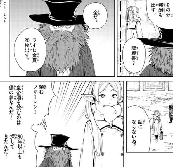 しかし、ファスは報酬としてライヒ金貨20枚を出すと言い、フリーレンに結界を破るように頼みますが、話にならないね、とフリーレンは言いファスの頼みを断ろうとします。ファスは、皇帝酒(ボースハフト)を飲むのは儂の夢なんだ!200年以上も探してきたんだ!と、フリーレンを説得しようとしますが、それでもフリーレンはファスの頼みを断ろうとします。