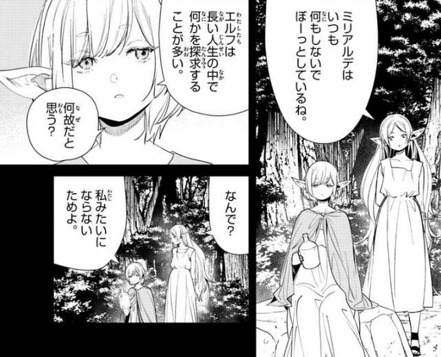 結界の解除もいよいよ大詰めとなり、明日には終わりそうになりますが、フリーレンは浮かない顔をします。フリーレンは、皇帝酒(ボースハフト)はね、美味しくないんだ、人生をかけるほど価値があるものじゃない、と言い、昔合ったエルフの事を思い出します。エルフの名前はミリアルデといい、ミリアルデはいつも何もしないでぼーっとしていました。エルフは長い人生の中で何かを探求することが多い、とミリアルデは言い、その理由として、私みたいにならないためよ、とフリーデンに説明します。