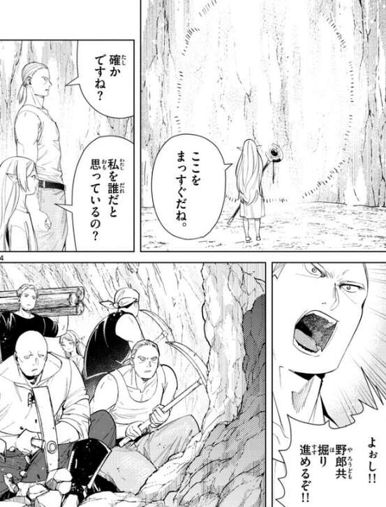 一方、鉱山に着いたフリーレンはノルムの部下に促され、魔法で何かを探し始めます。すぐに見つかったのか、フリーレンはノルムの部下に、ここをまっすぐだね、と指示します。すると、ノルムの部下はその場所を掘り進めます。