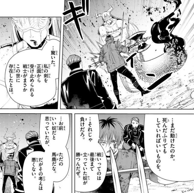 ゲナウが助けようとしたのは子供ではなく、72話で出てきたレヴォルテの部下の魔族で、魔族は元の姿に戻るとレヴォルテに褒めて…、と話しかけます。しかし魔族が話している途中で、ゲナウは黒金の翼を操る魔法で魔族の体を真っ二つにし、魔族を殺します。レヴォルテは部下の家族が殺されても特に気にせず、ご苦労、大儀だった、と言うだけでゲナウに再び向き合います。ゲナウは死んだ相棒の事が一瞬、頭をよぎったようで、判断が鈍ったな…、と心の中でつぶやきます。